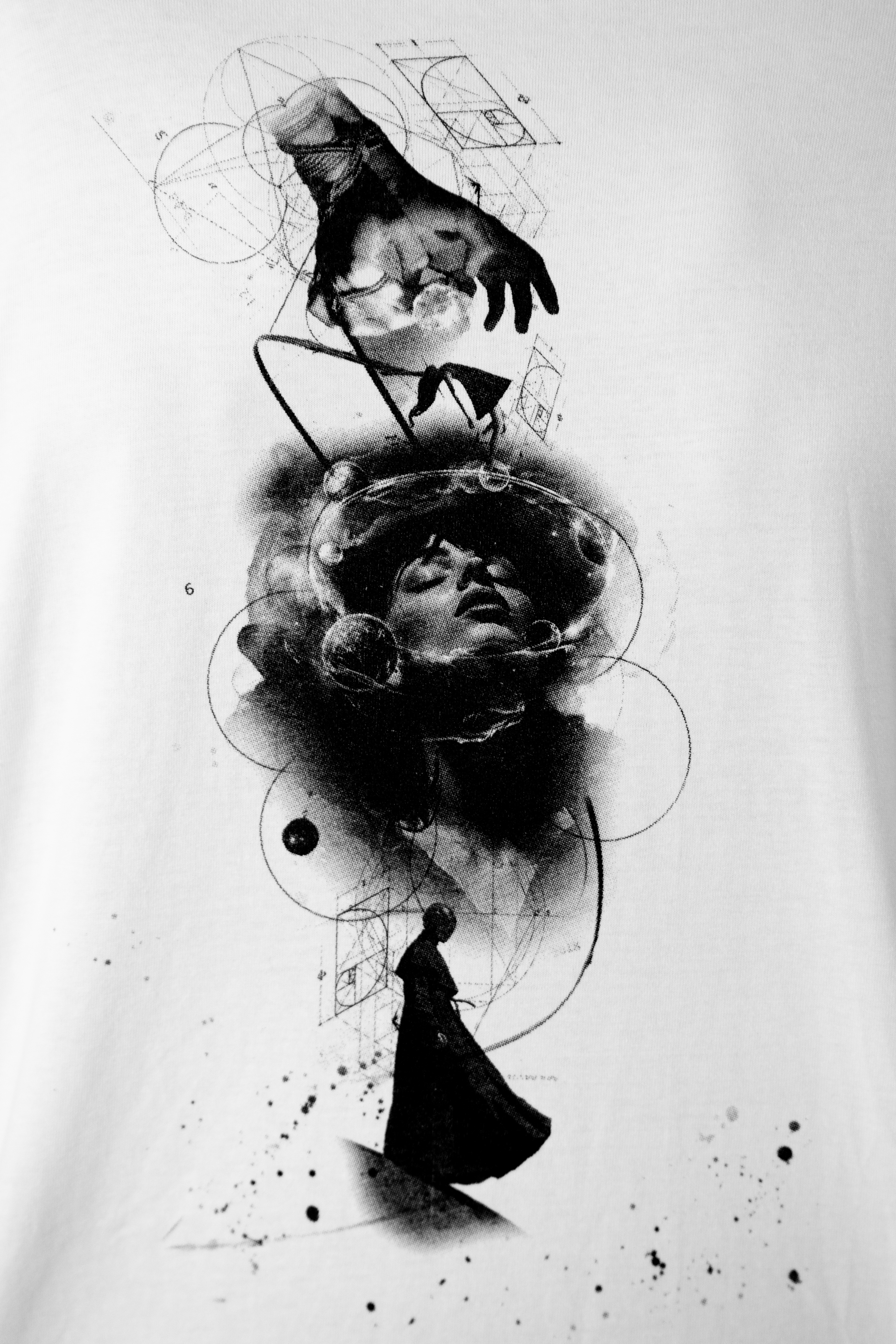 Hier stapel’ ich Ebenen wie Träume: Oben die Hand – Greifen nach etwas, das noch keine Form hat. In der Mitte ein Kopf, überblendet, als würde ein Gedanke zu Wetter werden. Unten die kleine Figur, fast verloren, aber standhaft. Das ist der Weg vom Impuls zur Identität. Die Kreise und Linien sind Koordinaten, keine Käfige. Ich frage: Was zieht Dich – Schwerkraft oder Sehnsucht? Antwort findest Du nur im Fallenlassen.
