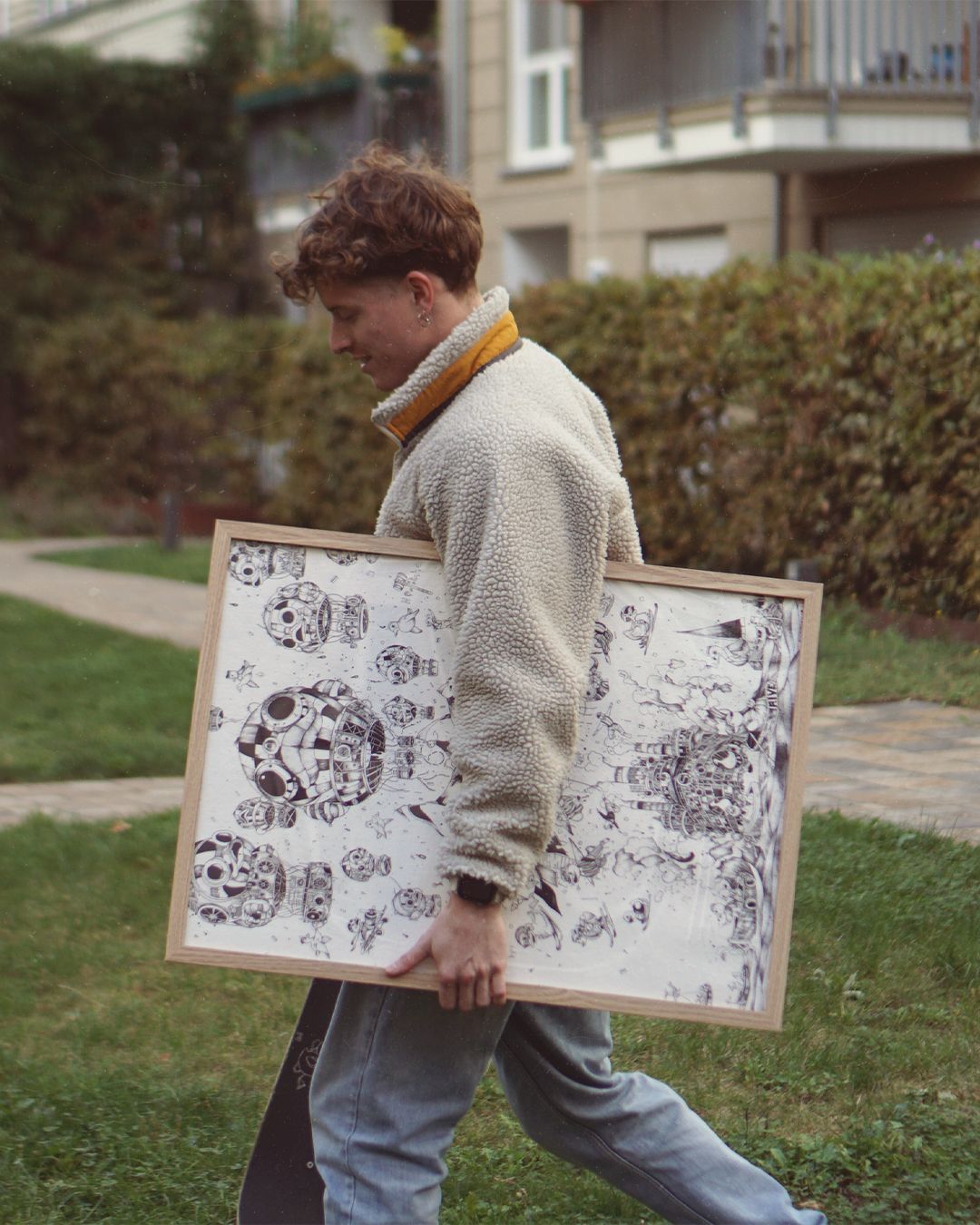 In letzter Zeit taucht Antonio tiefer in retrofuturistische und surreale Science-Fiction-Welten ein, in denen Enten die Kontrolle übernehmen, sich die Realität verbiegt und nichts so ist, wie es scheint. Seine Zeichnungen erzählen nicht nur