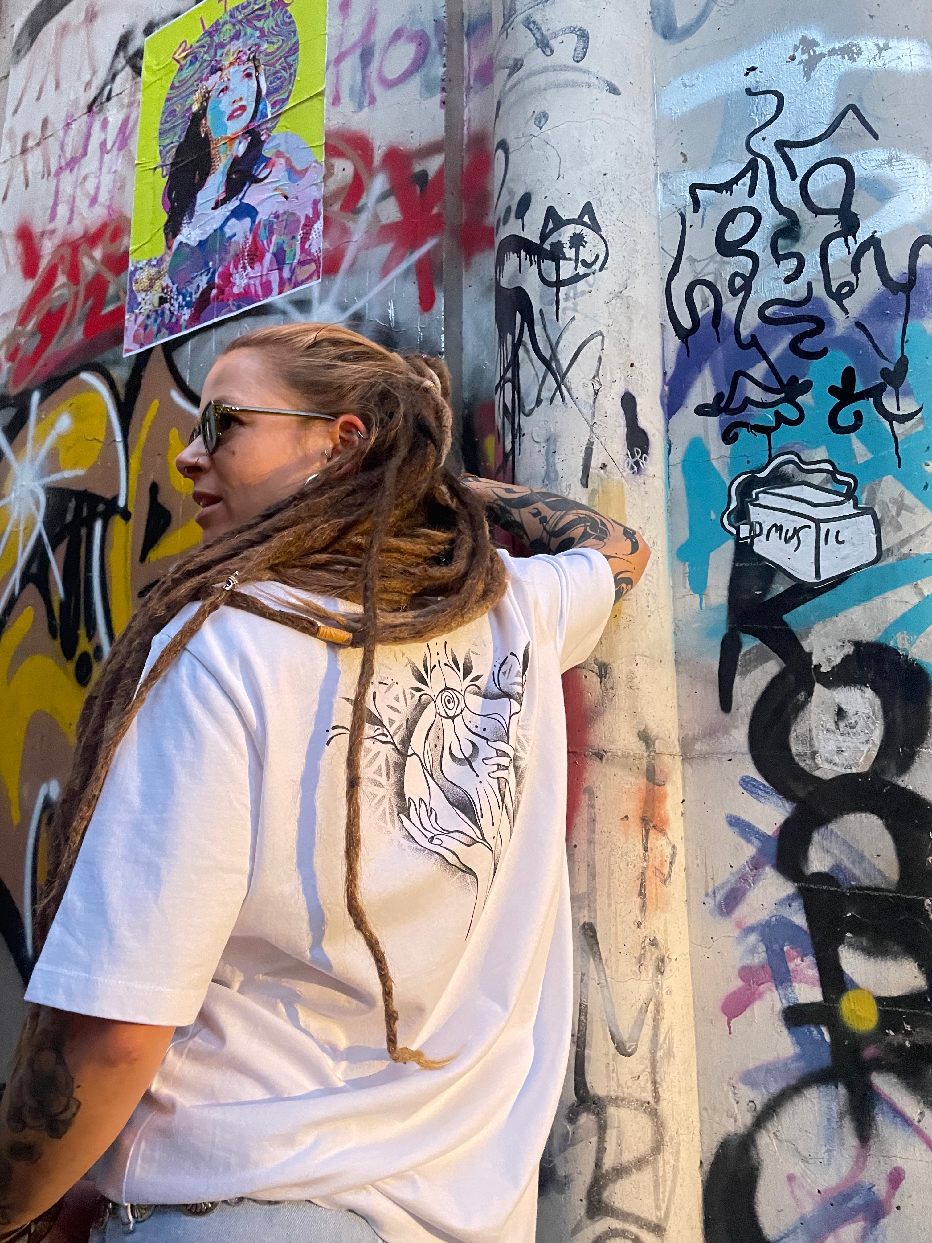 Unsere eigenen Kollektionen entstehen in enger Zusammenarbeit mit Künstler*innen aus Tattoo, Graffiti, Illustration und anderen visuellen Welten. Jedes Design erzählt eine Geschichte – limitiert, signiert, fair produziert und selbstverständlich profitieren hier die Künstler*innen bei jedem einzelnen Verkauf.