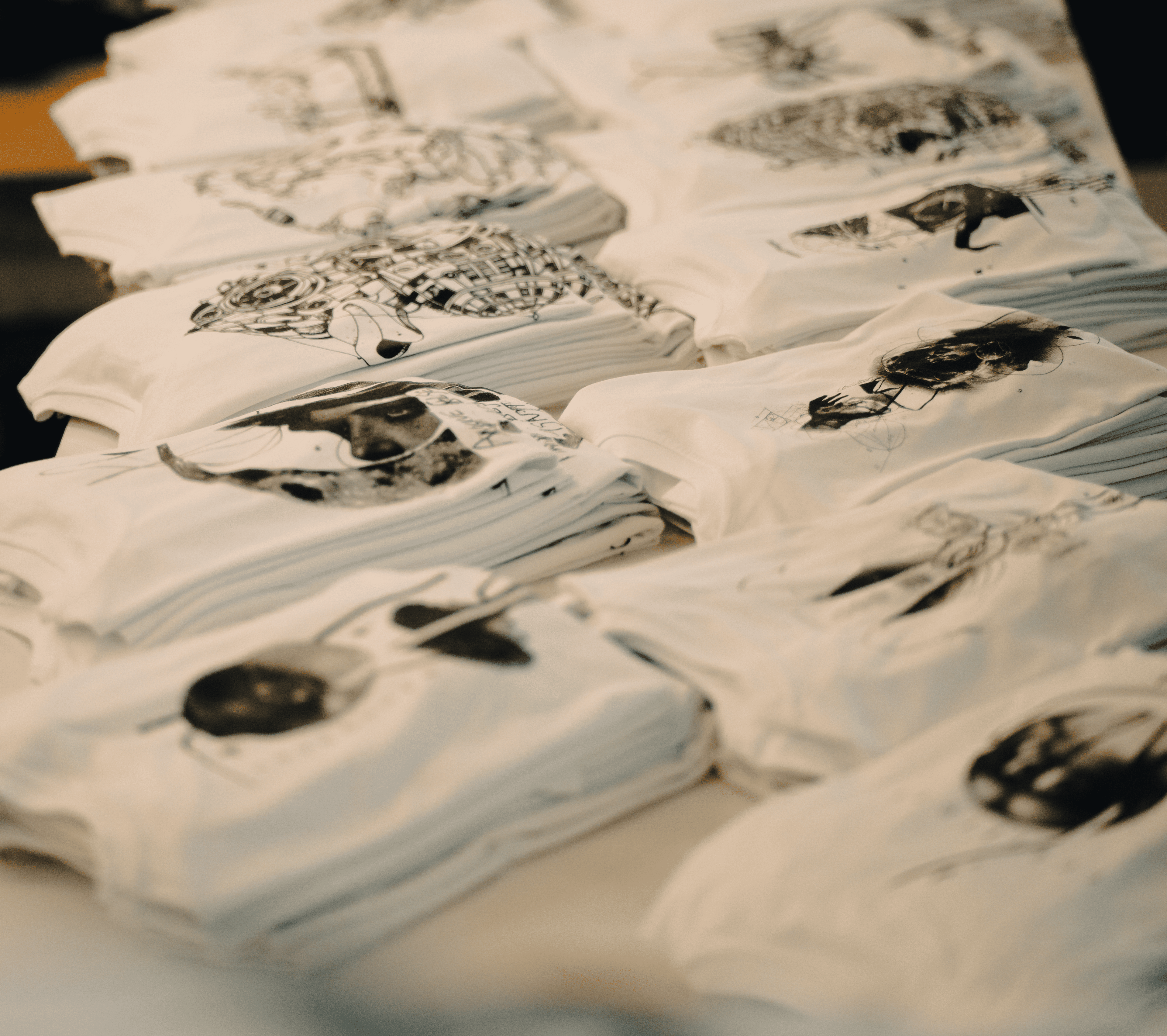 wir haben 15 T-Shirts mit 5 verschiedenen Artists designed und unterschrieben. Jedes einzelne per Hand gedruckt und sorgfälltig geprüft.