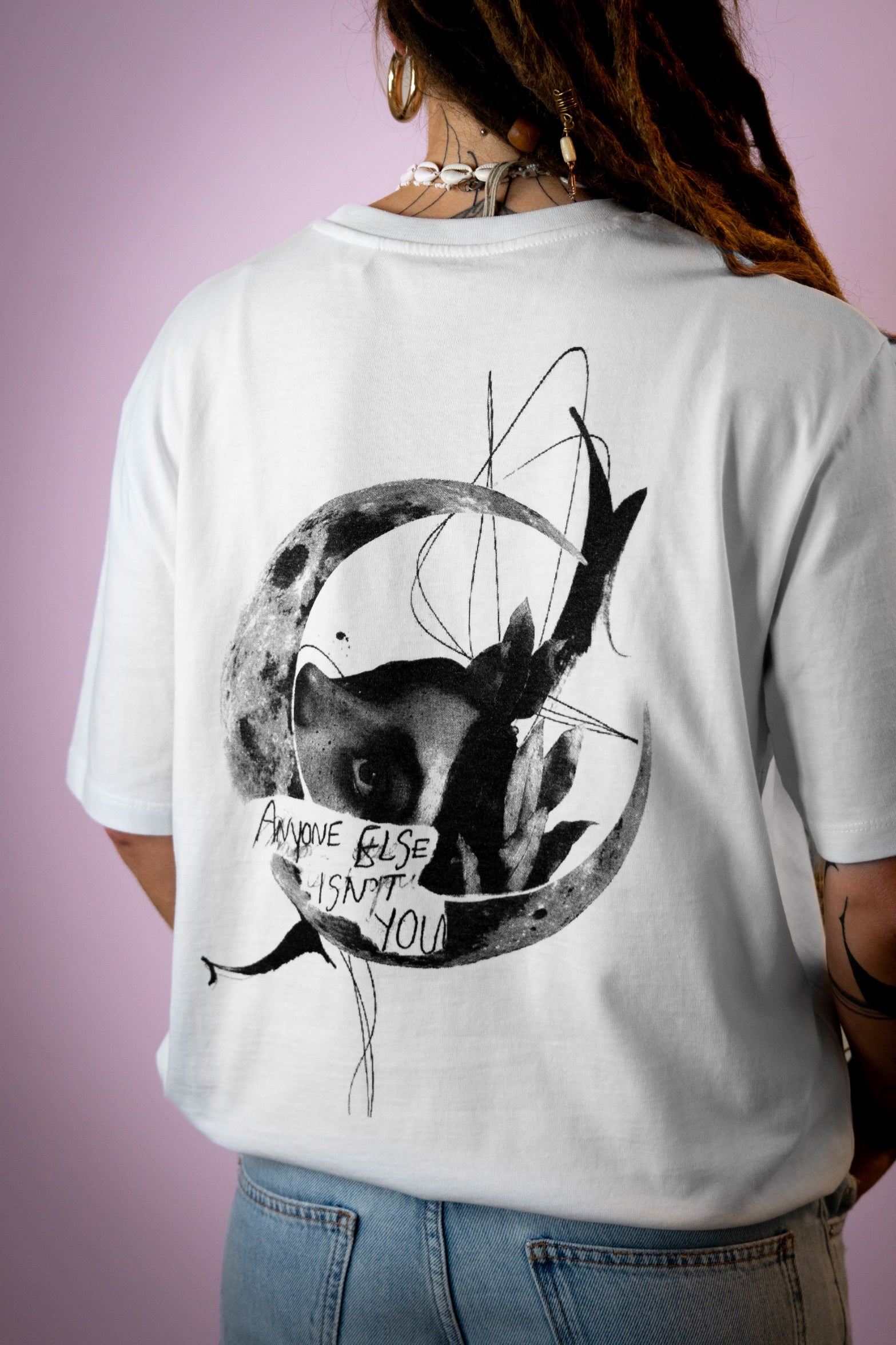 Bildet das Gefühl ab, mit dem Mond zu sprechen und auf eine Antwort zu warten, die längst in uns selbst liegt. Wir wünschen uns, anders zu sein, wie jemand anderes auszusehen – für mich konkret, dass meine Kunst „besser“ wäre und jemand anderem ähnelt – doch wir sind bereits einzigartig, ganz ohne diesen Versuch.