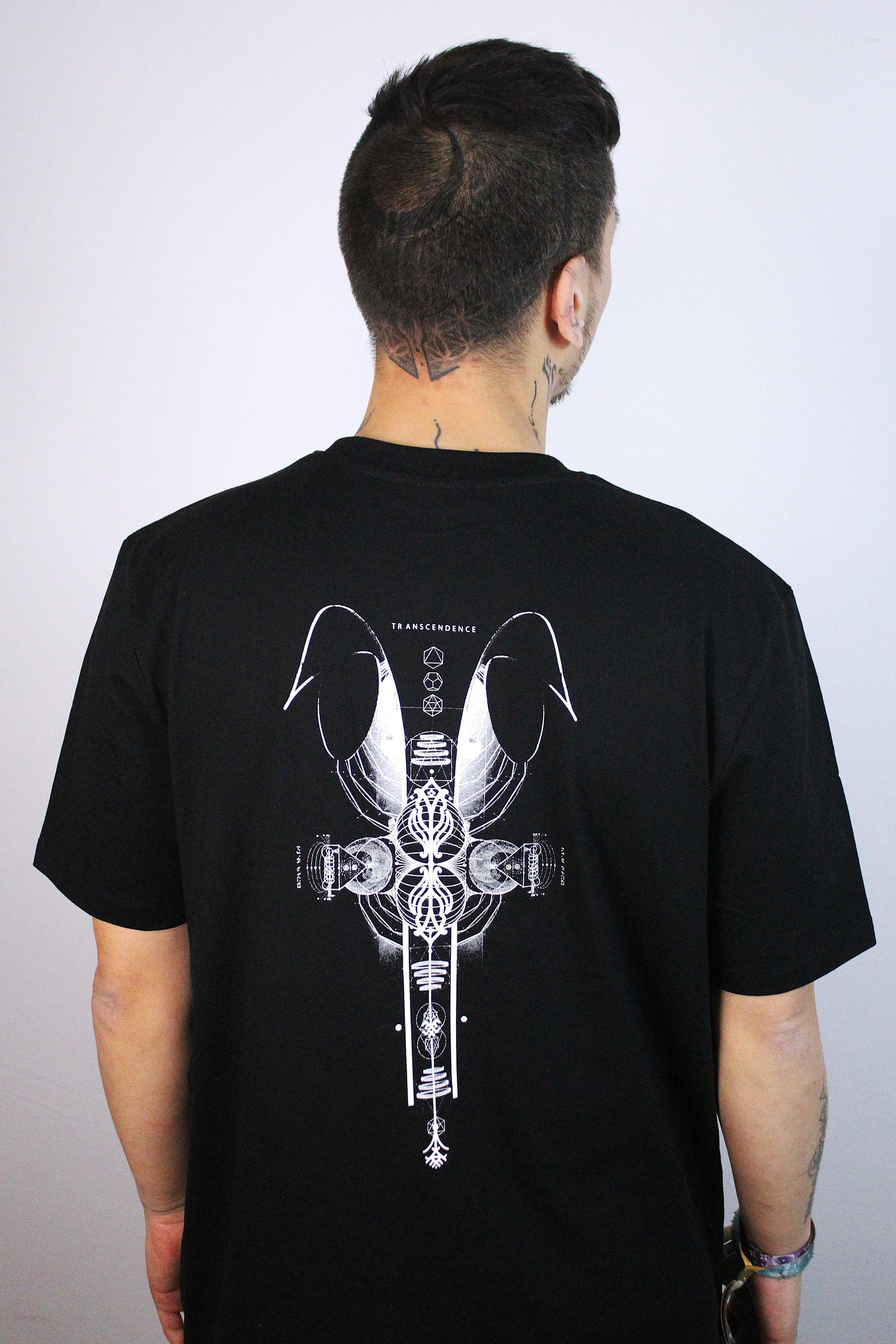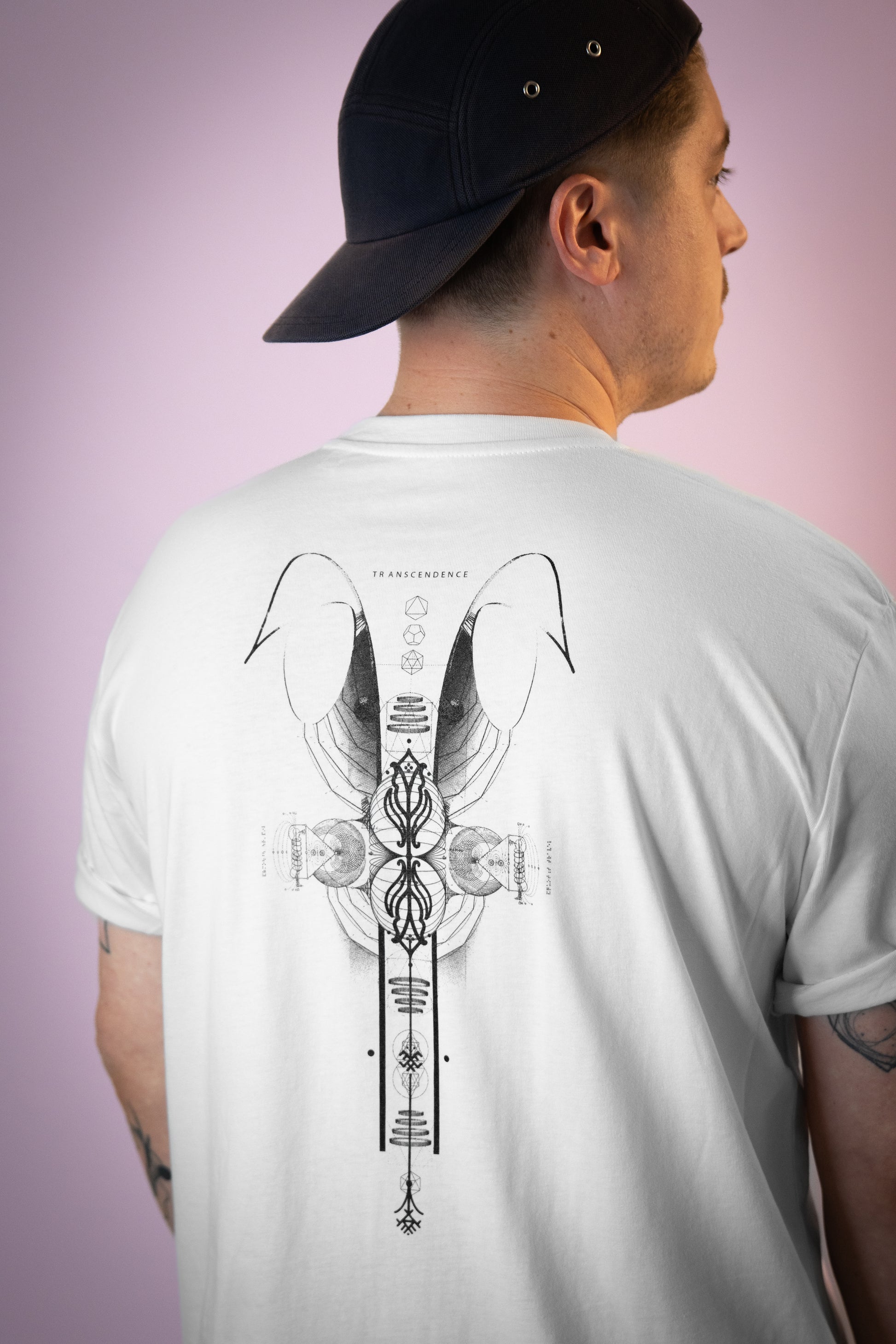 Ein Totem für Übergänge. Halb Tier, halb Sternkarte. Die Mondphasen sind der Atem des Motivs, die Symmetrie die Wirbelsäule. Ob Du Hörner, Flossen oder Flügel siehst, überlasse ich Deinem Unterbewussten. Für mich ist es ein Werkzeug: Es richtet mich aus. Transzendenz heißt hier nicht Flucht, sondern Durchgang – durch Schatten, Gezeiten, Muster. Wenn alles klickt, hörst Du diese leise, klare Note von „Weiter“.